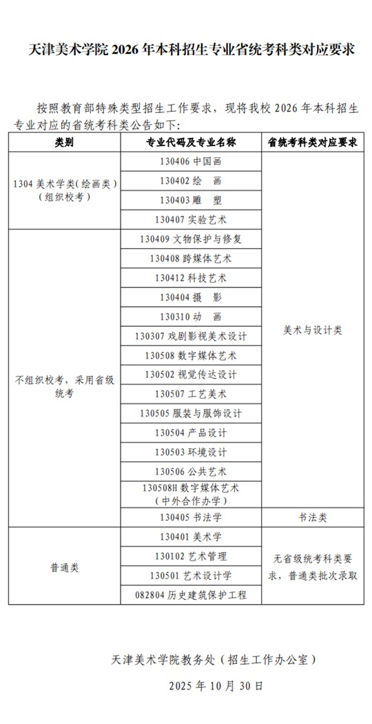 天津美術(shù)學(xué)院2026年本科招生專業(yè)省統(tǒng)考科類對應(yīng)要求