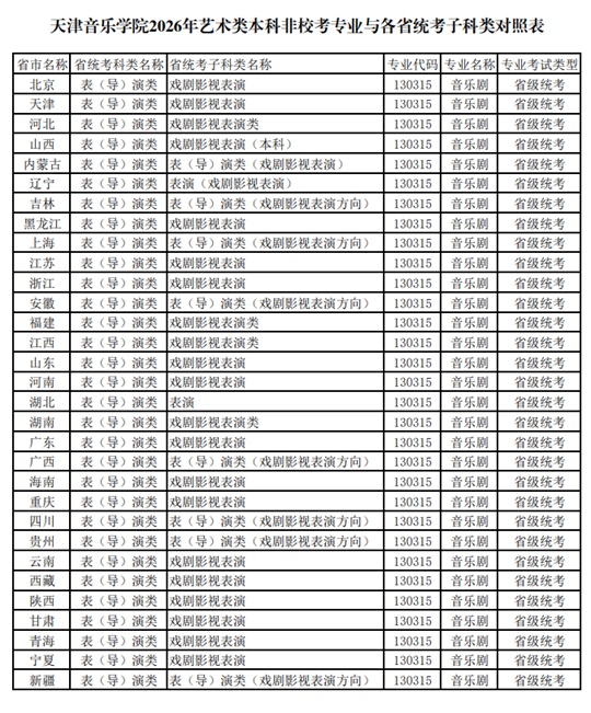 天津音樂(lè)學(xué)院2026年藝術(shù)類本科非校考專業(yè)與各省統(tǒng)考子科類對(duì)照表