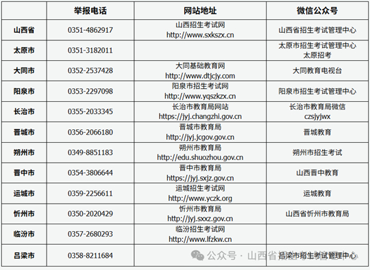 | 山西省2025年成人高考考試期間舉報電話、網(wǎng)站地址及微信公眾號 |