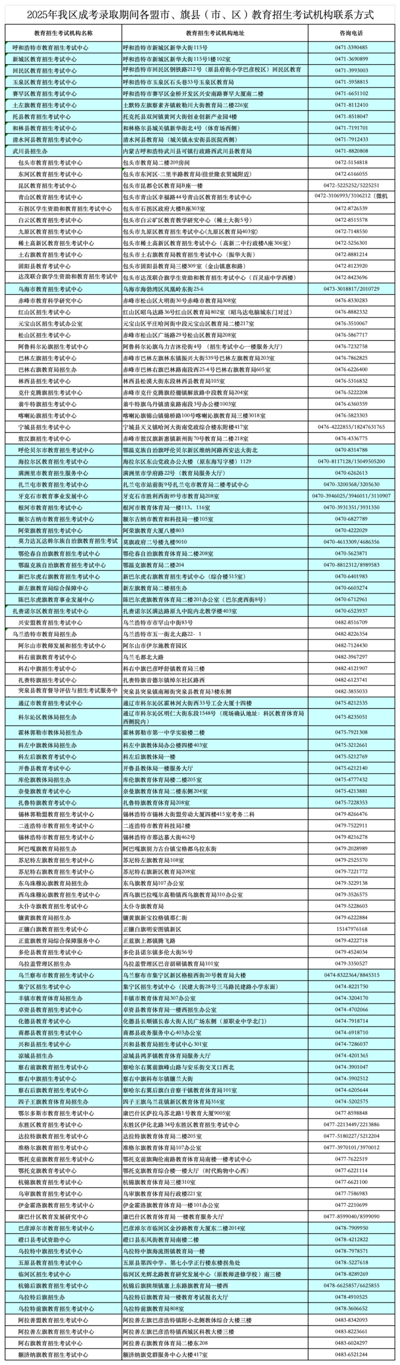 | 2025年內蒙古成考錄取期間各盟市、旗縣(市、區(qū))教育招生考試機構咨詢電話 |