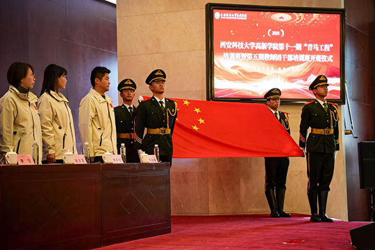 。▓D八)西安科技大學高新學院副院長王國良授予第十一期“青馬工程”培訓班班旗