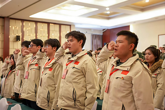 學院團委書記滕嬋娟為十一期“青馬工程”學員代表頒發(fā)學員證。青年代表手中的,不僅僅是學員證,更是“勤學善思、知行合一”的學風要求具象化傳遞!皬睦蠋熓种薪舆^的不僅是學員證,更是一份沉甸甸的責任!睂W生代表道出了在場學員的心聲。最后,全體學員的莊嚴宣誓,聲聲誓言在會場回蕩。這既是對革命先輩的承諾,更是對學!傲⒌聵淙恕备救蝿盏纳鷦踊貞