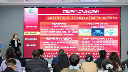 第十九屆“挑戰(zhàn)杯”國(guó)賽三等獎(jiǎng)指導(dǎo)老師李華君為在場(chǎng)師生帶來(lái)一場(chǎng)干貨滿滿的分享。其獲獎(jiǎng)項(xiàng)目以“特色產(chǎn)業(yè)融合助推縣域經(jīng)濟(jì)高質(zhì)量發(fā)展”為主題,聚焦陜南3市11縣茶產(chǎn)區(qū),組建跨工程造價(jià)、視覺(jué)傳達(dá)、網(wǎng)絡(luò)與新媒體、計(jì)算機(jī)等多學(xué)科團(tuán)隊(duì),歷經(jīng)三年深入調(diào)研,從產(chǎn)品、技術(shù)、文化、系統(tǒng)四個(gè)維度推動(dòng)茶產(chǎn)業(yè)升級(jí):在產(chǎn)品上融合安康富硒茶與涇陽(yáng)茯茶工藝,研發(fā)出金花菌更豐富、健康價(jià)值更高的富硒茯茶;在技術(shù)上設(shè)計(jì)新型自動(dòng)控溫控濕發(fā)花裝置,實(shí)現(xiàn)降本增效與發(fā)花均勻;在文化上挖掘“貢茶文化”“茶馬古道”內(nèi)涵,打造特色文創(chuàng)包裝;在系統(tǒng)上運(yùn)用全生命周期成本管理方法優(yōu)化茶產(chǎn)業(yè)園區(qū)建設(shè),并構(gòu)建“內(nèi)容+技術(shù)+渠道”立體傳播矩陣擴(kuò)大品牌影響。該項(xiàng)目不僅為地方茶產(chǎn)業(yè)注入新活力,也構(gòu)建了一套可復(fù)制、可推廣的鄉(xiāng)村振興數(shù)字化解決方案。李華君老師從選題立意、細(xì)節(jié)打磨,到跨學(xué)科協(xié)作與團(tuán)隊(duì)心態(tài)管理,全面拆解競(jìng)賽關(guān)鍵環(huán)節(jié),傾囊相授實(shí)戰(zhàn)經(jīng)驗(yàn),為學(xué)生們搭建起從校園學(xué)習(xí)走向國(guó)賽舞臺(tái)的堅(jiān)實(shí)橋梁。
