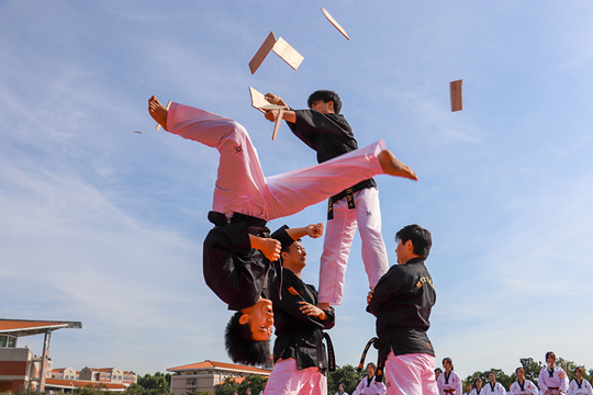 開幕式表演上,武術(shù)、跆拳道、瑜伽等俱樂部的學(xué)生代表帶來以“健康快樂”為主題的跆拳道表演。該表演由跆拳道俱樂部牽頭,融入特技等元素。同學(xué)們通過“方正承韻”“五星同心”“英才領(lǐng)航”“梯次登高”四幕表演,展現(xiàn)了嘉庚學(xué)子昂揚(yáng)的精神風(fēng)貌,為運(yùn)動(dòng)會(huì)拉開精彩序幕。