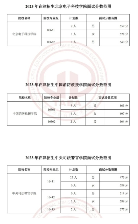 | 今年在津招生的北京電子科技學(xué)院、中國消防救援學(xué)院和中央司法警官學(xué)院面試分?jǐn)?shù)范圍確定(具體分?jǐn)?shù)范圍見附表)。