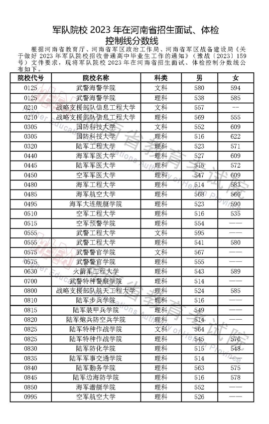 軍隊(duì)院校2023年在河南省招生面試、體檢控制線分?jǐn)?shù)線