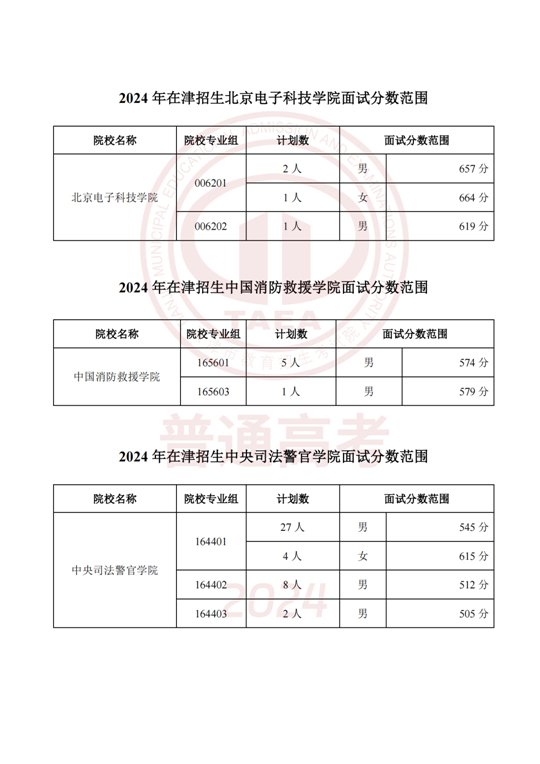 今年在津招生的北京電子科技學(xué)院、中國消防救援學(xué)院和中央司法警官學(xué)院面試分?jǐn)?shù)范圍確定(具體分?jǐn)?shù)范圍見附表)。