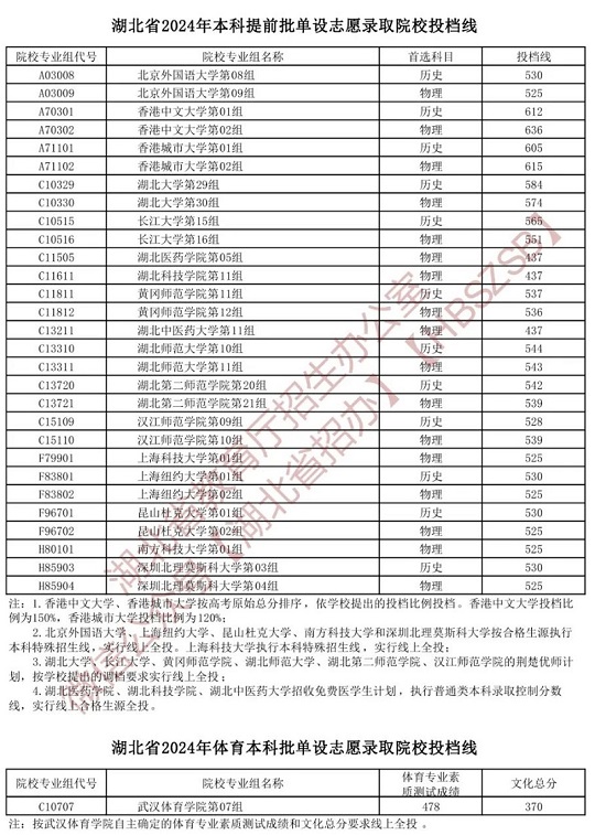 湖北省2024年本科提前批單設(shè)志愿、體育本科批單設(shè)志愿錄取院校投檔線