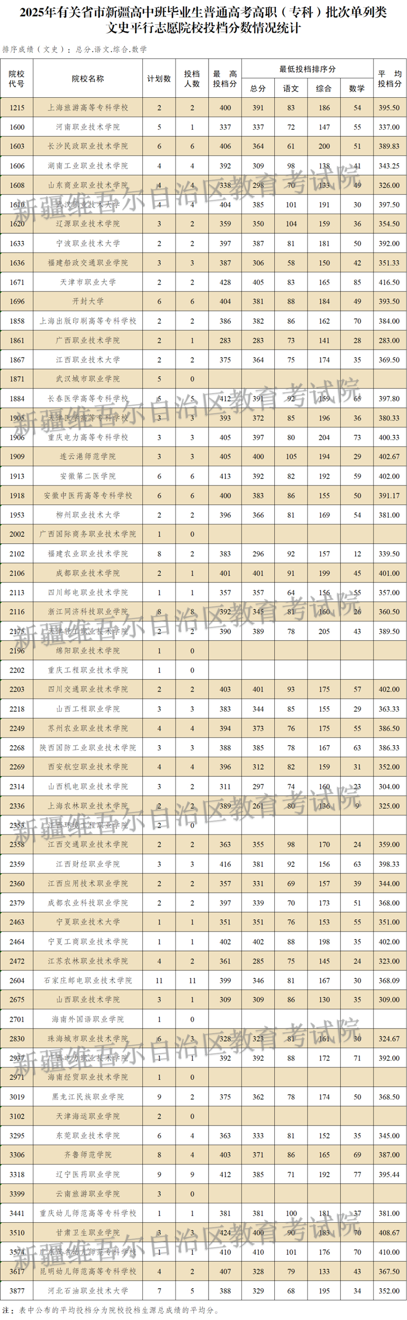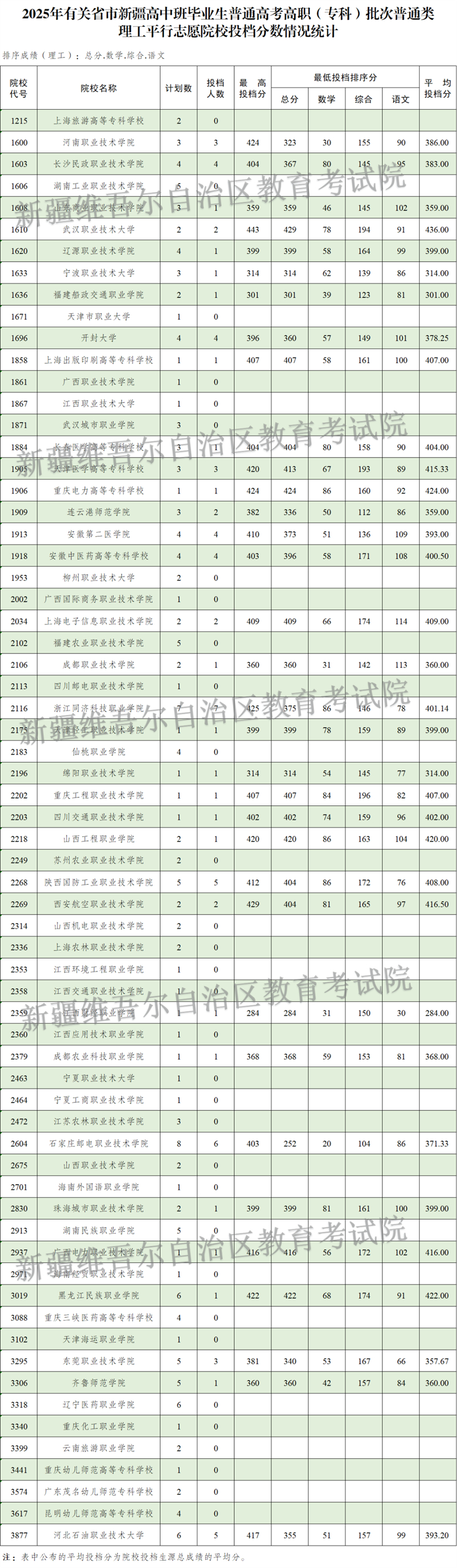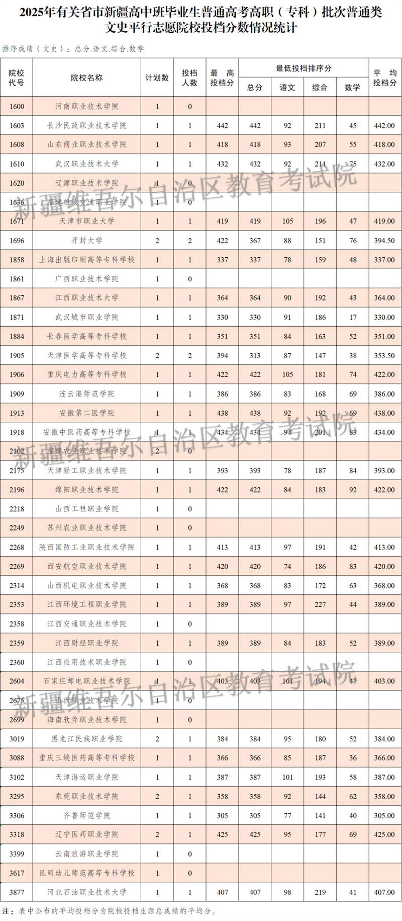 按照錄取工作安排,自治區(qū)2025年普通高校招收有關(guān)省市新疆高中班畢業(yè)生高職(?疲┡斡8月14日正式投檔錄取,新疆教育考試院根據(jù)投檔原則進(jìn)行了投檔,現(xiàn)將相關(guān)院校投檔情況公布如下: