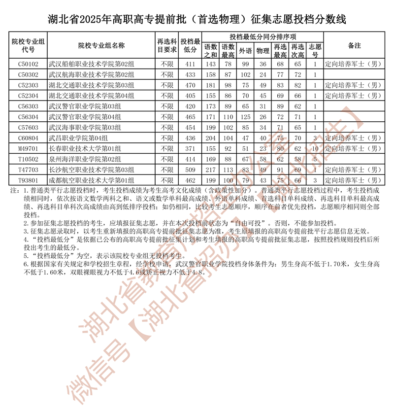 湖北省2025年高職高專提前批(首選物理)征集志愿投檔分數(shù)線