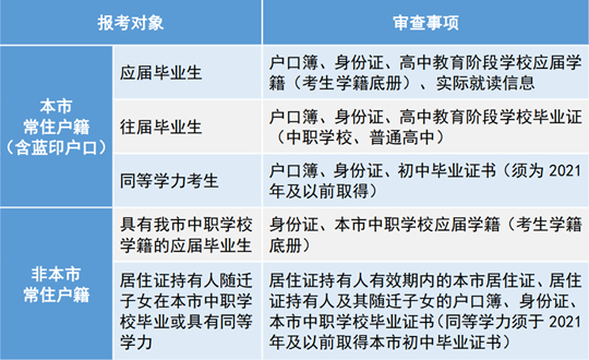 。2)具有本市常住戶籍的普通中專、職業(yè)高中、技工學(xué)校畢業(yè)生、普通高中往屆畢業(yè)生;具有本市中職學(xué)校正式學(xué)籍的應(yīng)屆畢業(yè)生;居住證持有人隨遷子女在本市中職學(xué)校畢業(yè)或具有同等學(xué)力。