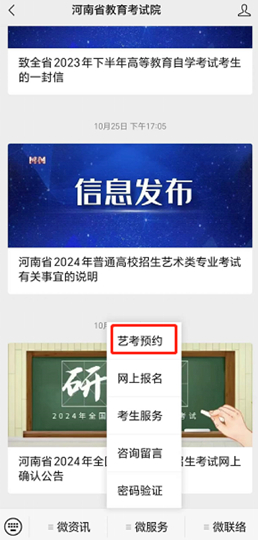點擊“河南省教育考試院”微信公眾號菜單,選擇【微服務(wù)】->【藝考預(yù)約】,進(jìn)入藝考預(yù)約的小程序,進(jìn)行預(yù)約操作。