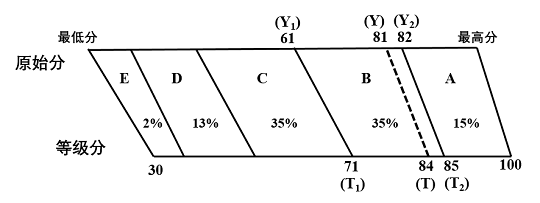 T1、T2分別表示等級賦分區(qū)間的下限和上限;