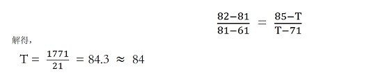 假設某同學思想政治學科原始分為81分,而該學科B等級的原始分分布區(qū)間為82——61,則該同學思想政治學科的原始分屬B等級,B等級的等級分分布區(qū)間為85——71,按照轉換公式該同學思想政治學科的等級分為: