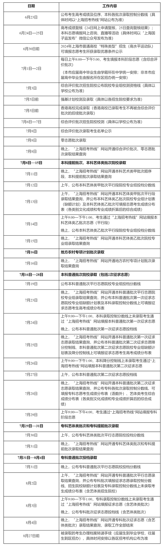 | 2024年上海市普通高等學(xué)校招生錄取工作日程 |