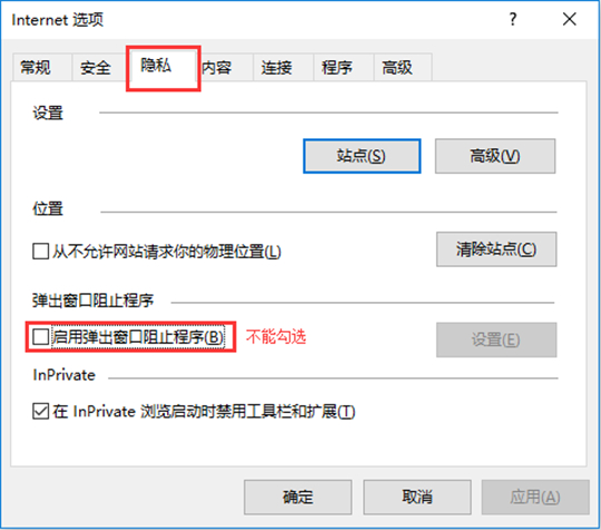 方法二:打開IE瀏覽器,點(diǎn)擊“設(shè)置”- “Internet(選項(xiàng))”-“隱私”,如下圖: