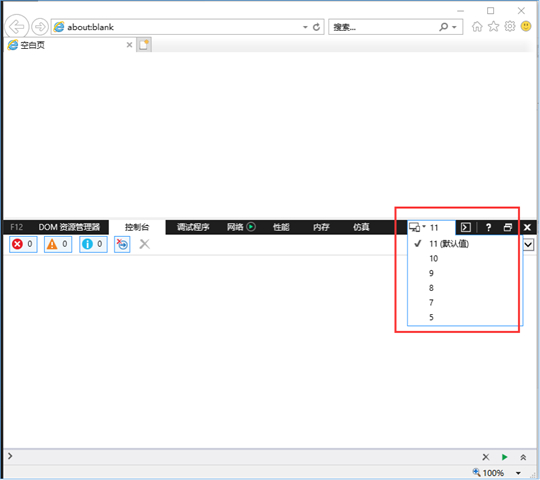 打開IE瀏覽器,點(diǎn)擊“F12”鍵,會出現(xiàn)瀏覽器模式設(shè)置,要求此處設(shè)置的版本必須與瀏覽器實(shí)際版本一致。