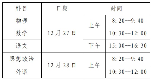 答:各學(xué)科試卷卷面分值為100分;歷史、地理、化學(xué)、生物學(xué)學(xué)科考試時(shí)長(zhǎng)為70分鐘;語(yǔ)文、數(shù)學(xué)、英語(yǔ)學(xué)科考試時(shí)長(zhǎng)為90分鐘;思想政治、物理學(xué)科考試時(shí)長(zhǎng)為80分鐘。