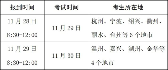 本次考試時間為11月28日—30日,按地區(qū)分三批在金華職業(yè)技術(shù)大學(xué)進行?忌氂诳荚嚽耙惶欤直救松矸葑C到組考學(xué)校辦理報到手續(xù),填寫考點規(guī)定的表格,領(lǐng)取準考證,了解考試安排情況。報到地點見金華職業(yè)技術(shù)大學(xué)招生網(wǎng)(https://zsw.jhc.edu.cn)通知。具體時間安排如下: