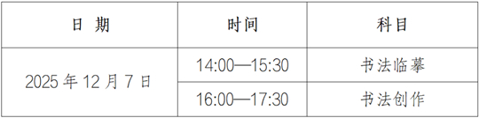 3.開考15分鐘后,考生不得進入考點參加相應科目考試。書法臨摹考試結束前15分鐘內方可交卷,交卷后不允許出場,不得接觸手機等違規(guī)物品。書法創(chuàng)作考試結束前30分鐘內方可交卷出場,交卷出場后不得再進場續(xù)考,也不準在考場附近逗留或交談。