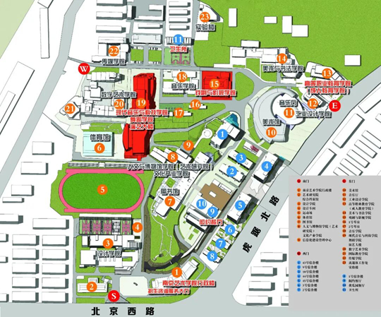表(導)演類考生從南藝南門進入后,經過上海美專牌坊石門,經由設計學院旁坡道向前直走,途經操場后經過演藝大樓后,經由道路下坡至百歲泉區(qū)域可達戲劇與影視學院考試區(qū)域。