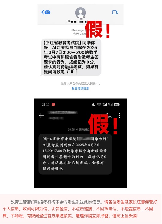 我省2025年高考正在進(jìn)行中,部分考生收到了所謂“浙江省教育考試院”的短信,稱在考試中被AI監(jiān)考發(fā)現(xiàn)其有違規(guī)行為,成績(jī)記為0分。