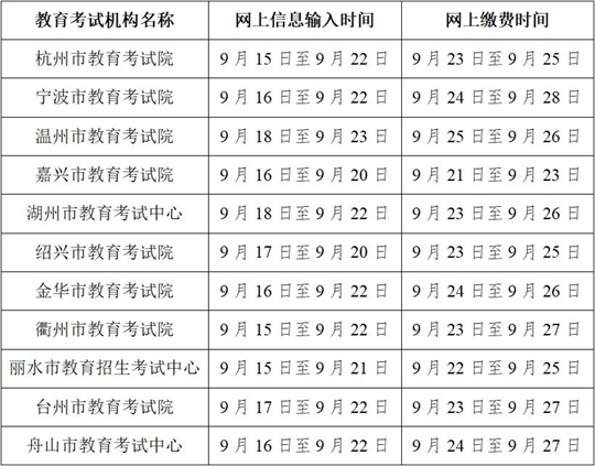 職業(yè)技能考試分理論知識和技能操作兩部分,本次報名的是技能操作考試。職業(yè)技能操作考試的報名條件等信息詳見各設(shè)區(qū)市發(fā)布的職業(yè)技能操作考試報名公告?忌傻卿浾憬〗逃荚囋壕W(wǎng)站(www.zjzs.net)“考試招生”欄目或點擊文末“閱讀原文”查看有關(guān)公告,并按當(dāng)?shù)毓娲_定的要求報考。報名流程主要為網(wǎng)上信息輸入和網(wǎng)上繳費兩階段,各地安排見下表。