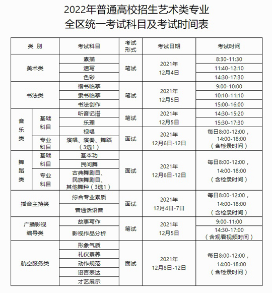 附件:2022年普通高校招生藝術(shù)類(lèi)專(zhuān)業(yè)全區(qū)統(tǒng)一考試科目及考試時(shí)間表