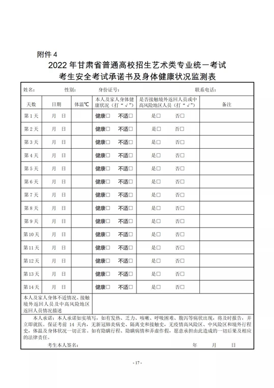 4. 2022年甘肅省普通高校招生藝術類專業(yè)統(tǒng)一考試考生安全考試承諾書及身體健康狀況監(jiān)測表