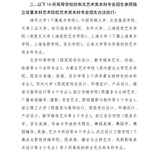 T段安排學(xué)校為:使用?汲煽兊莫(dú)立設(shè)置藝術(shù)高校、經(jīng)教育部批準(zhǔn)參照獨(dú)立設(shè)置藝術(shù)高校管理的普通高校(以下簡稱“獨(dú)立設(shè)置本科藝術(shù)類院校”,詳見附件1)和使用?汲煽兊慕逃恐睂倨胀ǜ咝5乃囆g(shù)類本科專業(yè),以及使用統(tǒng)考成績,但是不使用我省投檔規(guī)則的上述高校;使用我省音樂學(xué)(器樂)統(tǒng)考成績按照樂器種類招生且有明確的樂器種類招生計劃數(shù)的二本及以上高校本科專業(yè)等。