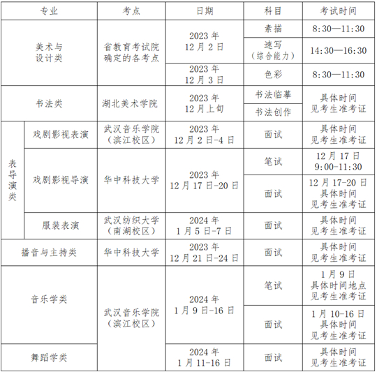 湖北省2024年藝術(shù)類各專業(yè)省級(jí)統(tǒng)考的考試時(shí)間安排見(jiàn)下表,考生面試具體考試時(shí)間以準(zhǔn)考證時(shí)間為準(zhǔn)。