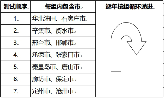 4.測試順序:采取循環(huán)遞進方式安排各市考生測試順序。具體辦法為:每2市為一組,按往年測試順序?qū)?4個市分為7個組,逐年按組循環(huán)遞進。2026年測試順序依次為: