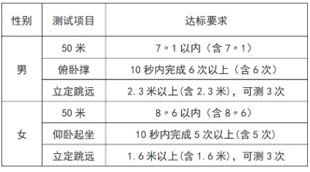 合格標(biāo)準(zhǔn):以上3個項目中有2個達(dá)標(biāo),體能測試結(jié)論即為合格。