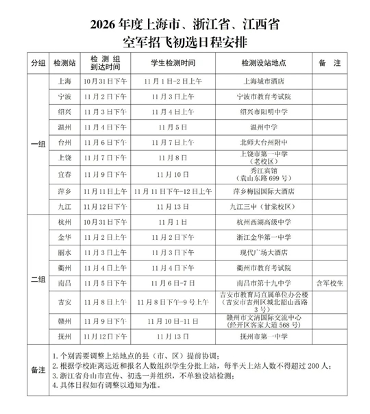 根據(jù)2026年度空軍招飛工作安排,11月1日至11月13日,空軍招飛局南京選拔中心將派初選組在上海市、浙江省、江西省各地市設站對報考空軍飛行學員的軍校生、高中生進行檢測。