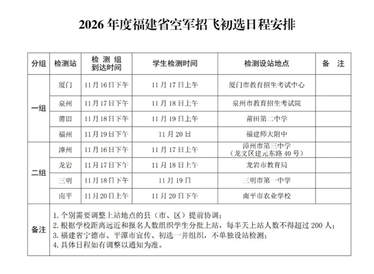 根據(jù)2026年度空軍招飛工作安排,11月17日至11月20日,空軍招飛局南京選拔中心將派初選組赴福建省各地市對報(bào)考空軍飛行學(xué)員的學(xué)生進(jìn)行檢測。