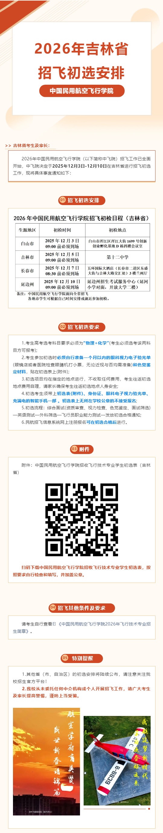 中國(guó)民用航空飛行學(xué)院2026年吉林省招飛初選安排