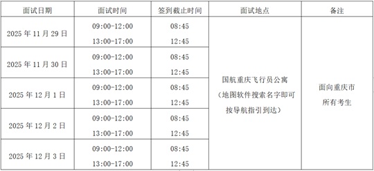 1.僅接受參加國航重慶地區(qū)線上初檢合格且在國航招飛管理平臺完成面試預約的考生參加面試,面試流程為:簽到(預約時間前15分鐘停止簽到)—身高體重復測—飛行職業(yè)能力傾向測試—英語能力測試—集中面試,每名考生考核及等候時間約為4小時,請考生合理安排出行計劃。
