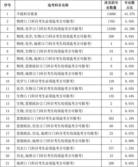 二、本次省內(nèi)外普通高校向我省報送2024年本科專業(yè)選考科目共計30690條,專業(yè)選考科目要求共有21種組合(見下表)。其中不提科目要求本科專業(yè)數(shù)量占本科專業(yè)總數(shù)的44.57%,選考科目要求物理、化學(xué)、生物、思想政治、歷史、地理科目的專業(yè)占比分別為51.1%、45.69%、1.62%、1.52%、1.58%、0.90%。另外選考科目要求“物理+化學(xué)”專業(yè)占比為44.28%。