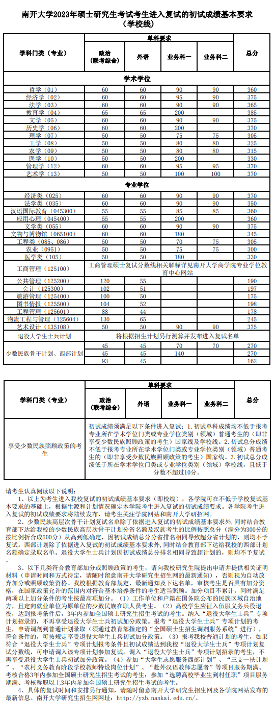 | 南開大學(xué)2023年碩士研究生考試考生進(jìn)入復(fù)試的初試成績基本要求 |