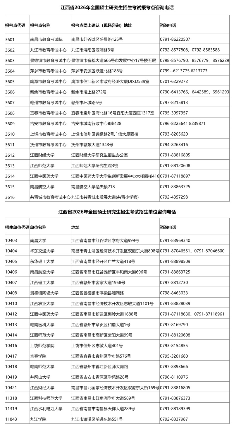 | 江西省2026年全國(guó)碩士研究生招生考試報(bào)考點(diǎn)和招生單位咨詢電話 |