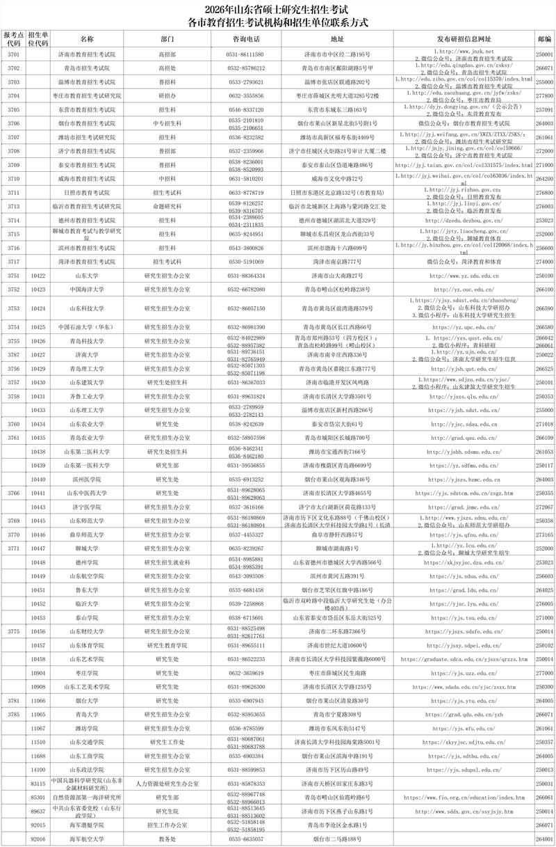 | 2026年山東省碩士研究生招生考試各市教育招生考試機構(gòu)及招生單位聯(lián)系方式 |