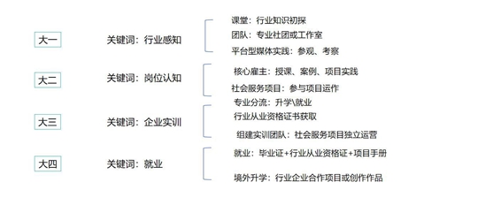“以學(xué)生為中心的成長(zhǎng)發(fā)展系統(tǒng)”是文化傳媒學(xué)院的教育核心。在推動(dòng)傳媒教育革新的過程中,文化傳媒學(xué)院制定了以雇主為導(dǎo)向的人才培養(yǎng)產(chǎn)教融合路徑,構(gòu)建伴隨式教學(xué)實(shí)踐模式。