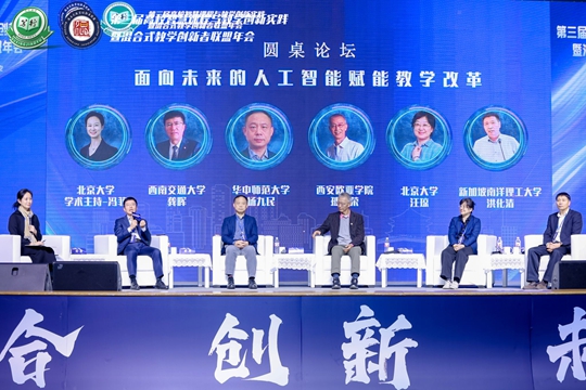隨后的圓桌論壇上,西安歐亞學(xué)院副校長(zhǎng)孫建榮教授、華中師范大學(xué)國(guó)家級(jí)文科綜合教學(xué)示范中心主任楊九民教授、北京大學(xué)教育學(xué)院汪瓊教授、新加坡南洋理工大學(xué)洪化清教授、西南交通大學(xué)力學(xué)與航空航天學(xué)院龔暉教授5位專家學(xué)者以“面向未來的人工智能賦能教學(xué)改革”主題展開探討交流。論壇由北京大學(xué)數(shù)字化學(xué)習(xí)研究中心主任助理馮菲教授主持。