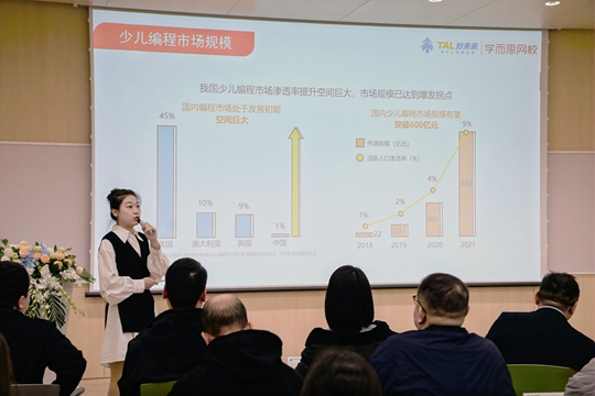 北京學(xué)而思教育科技有限公司西安分公司崗前培訓(xùn)負(fù)責(zé)人雷丹陽(yáng)講解了新形勢(shì)下的少兒編程賽道,分享了數(shù)字化教育背景下學(xué)而思教育科技機(jī)構(gòu)如何運(yùn)營(yíng)少兒編程,并指出了數(shù)字化教育下的人才發(fā)展需求。她說(shuō),編程行業(yè)已進(jìn)入成熟期,教育數(shù)字化是“新賽道、新優(yōu)勢(shì)、突破口”,企業(yè)普遍面臨數(shù)字化人才短缺,應(yīng)加大招聘力度,優(yōu)化教育培訓(xùn)體系,從而滿足市場(chǎng)發(fā)展需求。