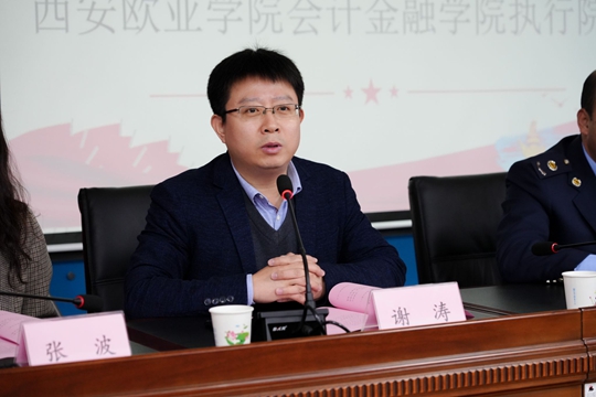 隨后,西安歐亞學(xué)院會(huì)計(jì)金融學(xué)院執(zhí)行院長(zhǎng)謝濤代表學(xué)院致辭。他對(duì)高新區(qū)稅務(wù)局及稅友集團(tuán)的支持表示感謝,并提到:“實(shí)習(xí)實(shí)踐基地的設(shè)立為學(xué)生們提供了一個(gè)從課堂走向社會(huì)的重要橋梁。通過(guò)今天的研學(xué)課堂,希望同學(xué)們能夠更深入地理解稅務(wù)工作,提升專業(yè)素養(yǎng),并在未來(lái)的職業(yè)發(fā)展中找到明確的方向!