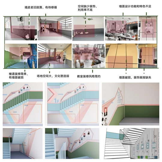 基于教學(xué)樓環(huán)境現(xiàn)狀,雙方確定為30間教室增設(shè)統(tǒng)一的功能欄,以提升教學(xué)設(shè)施的實(shí)用性;同時(shí),在教學(xué)樓1至3層的公共走廊及教室外墻等區(qū)域增設(shè)36處校園文化展示,旨在改善公共區(qū)域的視覺效果,豐富學(xué)生的課余精神生活。此外還針對(duì)樓梯間、走廊墻面陳舊脫落、缺乏視覺要素等問題進(jìn)行設(shè)計(jì)改造,以進(jìn)一步優(yōu)化教學(xué)樓的整體布局和使用體驗(yàn),營造一個(gè)更加和諧美好的學(xué)習(xí)生活環(huán)境。