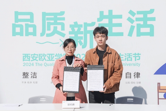 10月23日下午,西安歐亞學(xué)院330余名師生齊聚虹橋碎石廣場共同見證了品質(zhì)生活節(jié)開幕。各青年社區(qū)主管與學(xué)生代表帶著對價值觀的認同和對同學(xué)的期許分別簽訂了《2024年行為引導(dǎo)目標責任書》與《學(xué)生行為承諾書》,以“輕約束”的管理模式,注重學(xué)生契約精神的培養(yǎng),從而實現(xiàn)自我約束。