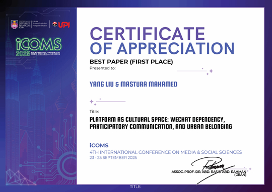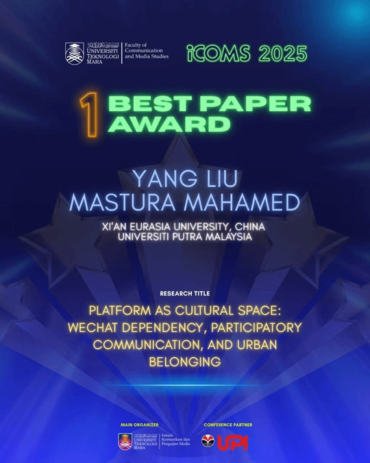 西安歐亞學院文化傳媒學院網(wǎng)絡與新媒體專業(yè)專職教師、馬來西亞博特拉大學現(xiàn)代語與傳播學院在讀博士劉陽參加大會分論壇演講,并憑借研究主題Platform