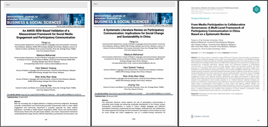 2025年初,探究團隊相繼在Scoups等國際期刊發(fā)表三篇相關論文:首先,運用AMOS-SEM模型驗證社交媒體參與與參與式傳播的測量框架,為后續(xù)研究建立方法基準;其二,基于系統(tǒng)文獻回顧提出“從媒介參與到協(xié)作治理”的多層分析框架,將傳播行為放入公共協(xié)同語境;其三,總結參與式傳播在社會變遷與可持續(xù)性議題中的作用與啟示。