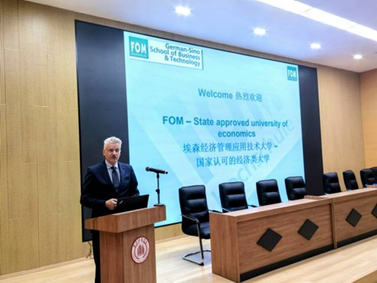 講座中,Andreas Stoffers教授圍繞FOM大學(xué)的課程體系與核心優(yōu)勢展開分享。他詳細(xì)介紹了該校在應(yīng)用型人才培養(yǎng)方面的特色課程設(shè)計,以及與行業(yè)接軌的教學(xué)模式,讓在場師生對德國高等教育的實踐導(dǎo)向有了直觀認(rèn)識。